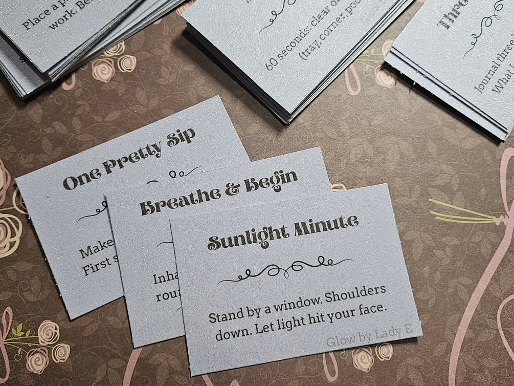Glow Cards are your gentle companions for when the day feels too loud, too much, or just a little off. This 32-card printable deck offers tiny resets you can actually do - right where you are, with what you have. Just shuffle, pull a card, and follow the soft cue.